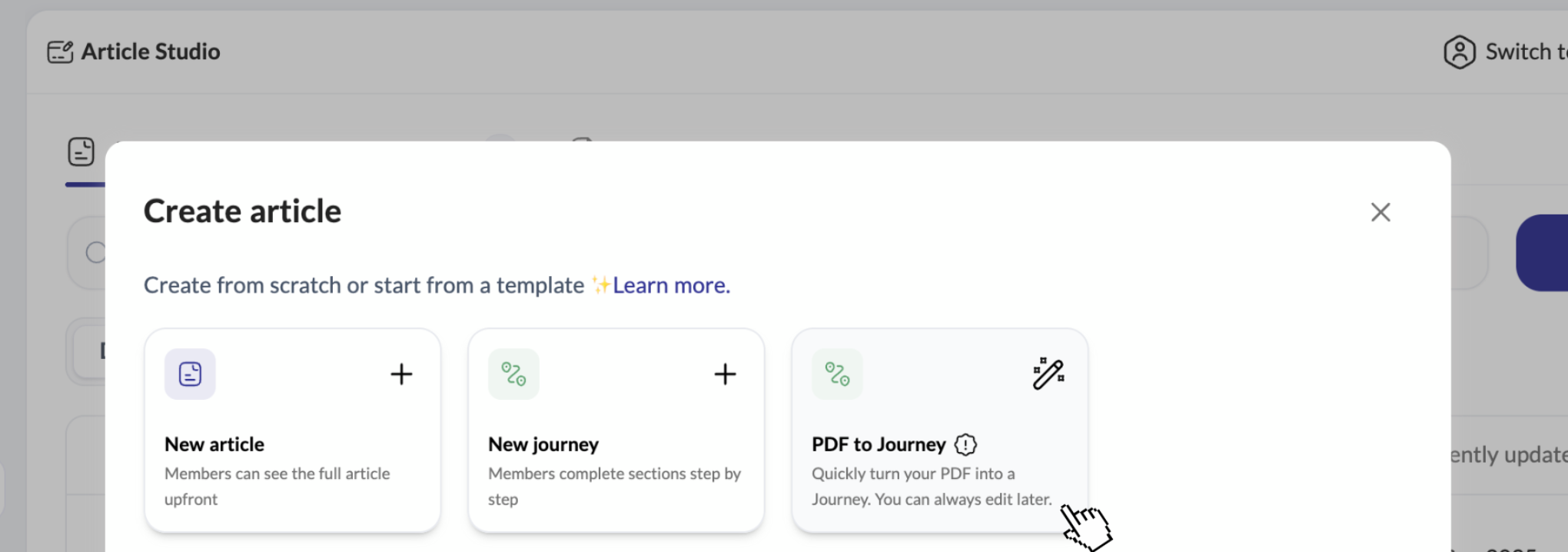 Turn static PDFs into interactive Journeys with quizzes, yes/no questions, images, and automatically generated sections from your PDF content. This makes it easy to transform existing documents into engaging learning experiences for your teams.